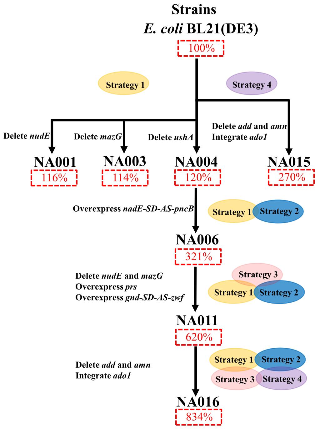 图二. 提高大肠杆菌NAD+生物合成的多策略代谢工程改造效果图