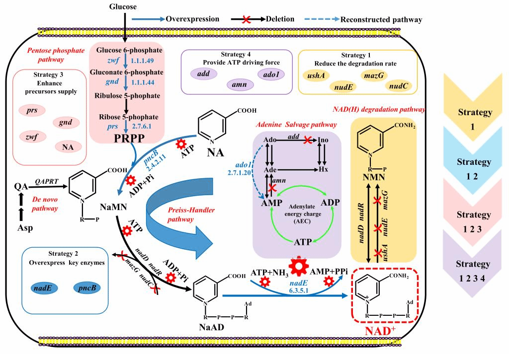 穆晓清副教授团队展示了通过削弱产物降解途径、强化合成途径关键酶、增加合成底物供给和调控能量代谢等多策略代谢工程解决大肠杆菌中NAD+生产的瓶颈。首先,阻断NAD(H)的降解途径会使胞内NAD+的积累提高39%。第二,过表达NAD +的 Preiss-Handler合成途径中的关键酶,可以导致NAD +浓度提高221%。第三,将PRPP合成模块和Preiss-Handler途径结合起来以增强辅酶合成前体物质的供应,使NAD+含量提高520%。第四,增加ATP含量导致NAD +胞内浓度提高170%。最后,结合以上所有改造策略,构建了高产NAD +菌株,其细胞内NAD+浓度达到26.9μmol/ g DCW,是出发菌株的834%。这项研究通过多策略调控代谢工程设计了高效生产NAD+的菌株,为进一步扩大辅酶类天然产物的生物合成和工业化应用奠定了基础。