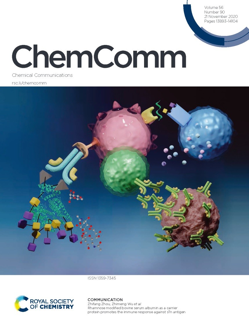 糖化学与生物技术教育部重点实验室吴志猛教授团队在肿瘤相关糖类疫苗研究方面取得重要进展,研究成果“Rhamnose modified bovine serum albumin as a carrier protein promotes the immuneresponse against sTn antigen”正式发表于Chemical Communications (Top 期刊,IF = 5.996) (//doi.org/10.1039/D0CC05263A),并被评选为封面论文(Front Cover)。