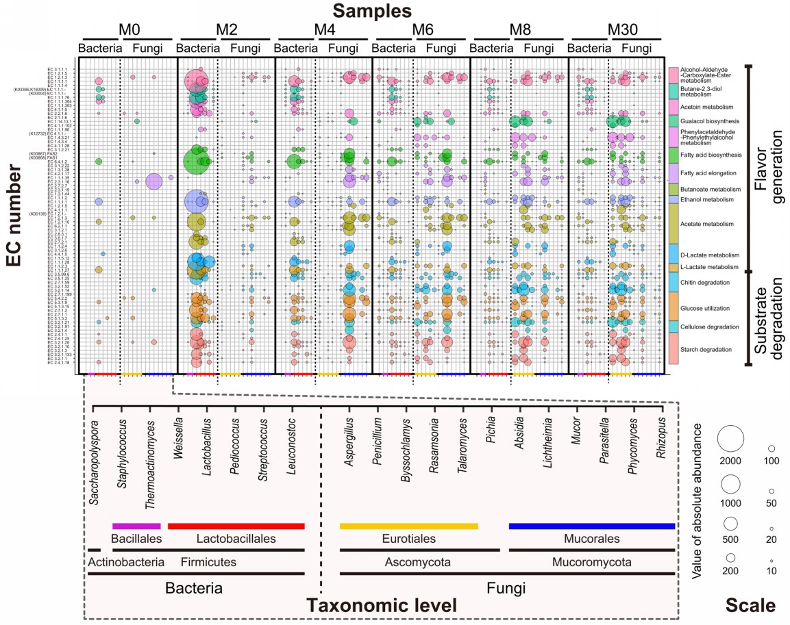 在大曲发酵过程中乳杆菌目(主要为魏斯氏菌属Weissella、乳杆菌属Lactobacillus和片球菌属Pediococcus)、毛霉菌目(主要为横梗霉属Lichtheimia)和散囊菌目(主要为曲霉属Aspergillus、Rasamsonia和丝衣霉属Byssochlamys)先后成为主要功能微生物类群,它们相继承担了一系列裂解酶和风味前体/化合物的代谢任务。通过宏组学结果构建了大曲主要风味物质形成的微生物代谢网络,发现细菌中魏斯氏菌属、乳杆菌属、葡萄球菌属Staphylococcus参与2,3-丁二醇代谢,高温放线菌属Thermoactinomyces参与丁酸代谢。真菌中参与愈创木酚和4-乙烯基愈创木酚生物合成的类群主要分布在丝衣霉属和曲霉属。基于相关性分析结果推测大曲发酵早期的高酸高温环境主要是由乳酸杆菌属和横梗霉属的分解代谢活动造成的,而这一逆性环境有助于大曲微生物群落有效的自我净化。进一步对白酒酿造过程菌群结构和演替规律进行分析,发现大曲优势微生物类群(如明串珠菌、嗜热子囊菌及嗜热真菌等)主要作用于酿酒过程的前期,而其中低丰度微生物是酿酒过程后期优势微生物的重要组成部分,如耐酸乳杆菌(Lactobacillus acetotolerans)和Kazachstania在发酵中后期丰度占比超过50%。