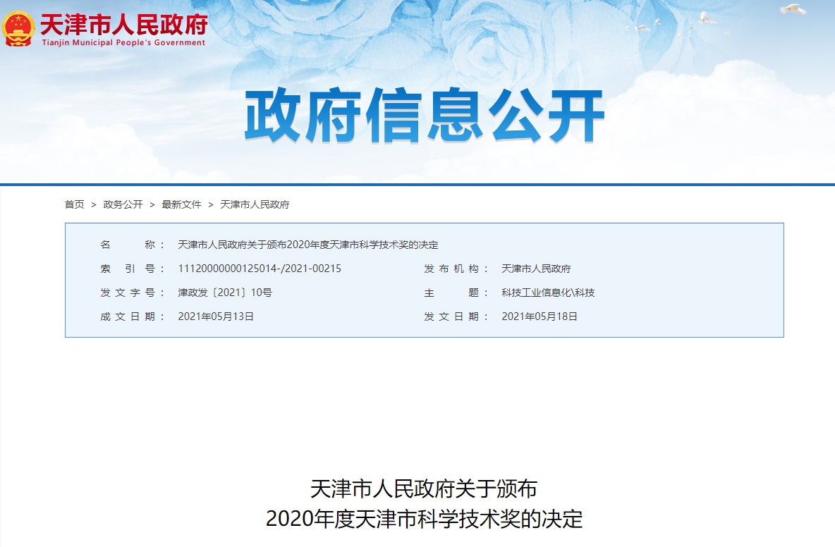 5月18日,天津市人民政府正式发文颁布了2020年度天津市科学技术奖的决定。91色