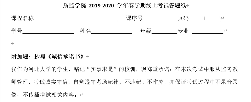 2019-2020 学年春学期线上考试答题纸(模板)》,将课程名称、学号、姓名、班级等信息抄写在答题纸上,并抄写“诚信承诺书”,没有抄写上述信息的答题纸一律作废。