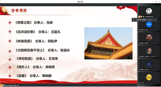 分享会上,肖森、王超凡、郑凯尹、张涵冰四名同学首先分享了《青春之歌》《白洋淀纪事》《林海雪原》《太阳照在桑干河上》等红色经典书籍,他们或介绍故事内容,或展现时代背景,或描述事件经过,或解说行文思路,介绍了不同时期、不同岗位革命者的奋斗故事,向同学们展示了革命年代坚强、乐观的精神力量。之后,王佳伟同学分享了《学问有道》,他从“学历史”出发,介绍了书中展现的百年来中国共产党挑战、尝试、收获,鼓励同学们“学问有道,求仁义而已”。本次读书分享会同学们分享的书目涉猎广泛,余杨青和韩娴静还分别分享了《局外人》和《皮囊》两本书籍,受到了大家好评。