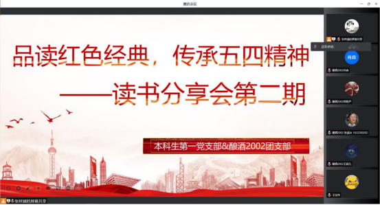 5月6日晚,91色 本科生第一党支部与酿酒2002“赤水河”特称团支部,以“品读红色经典,传承五四精神”为主题举办读书分享会。来自党支部和团支部的7名同学依次进行分享,学院200余名同学线上参与,大家在书籍中与前人思想交汇,启迪思想;在红色经典中学习百年党史,坚定信念。