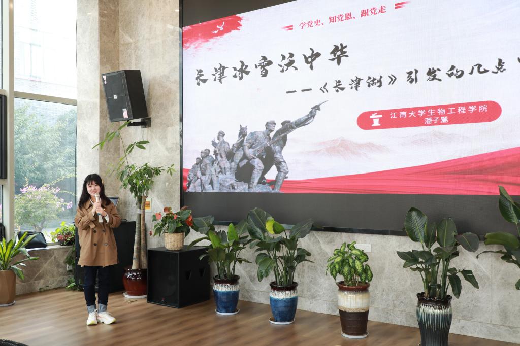 在玉祁运动力馆,博士生杜如冰向企业同仁讲解了《白酒酿造过程微生物及产物分析》,从酿造的历史起源到微生物产物代谢结尾,他从专业角度上向大家分享了酿造与酒文化的魅力。为进一步深化党史学习教育、致敬建党百年,学院党史宣讲团成员、生物1901班本科生潘子翯以国庆热片《长津湖》为引子,向大家介绍了人民志愿军舍生忘死、不畏艰险打赢抗美援朝战争的艰辛历程,深入阐释了抗美援朝精神的现实意义。