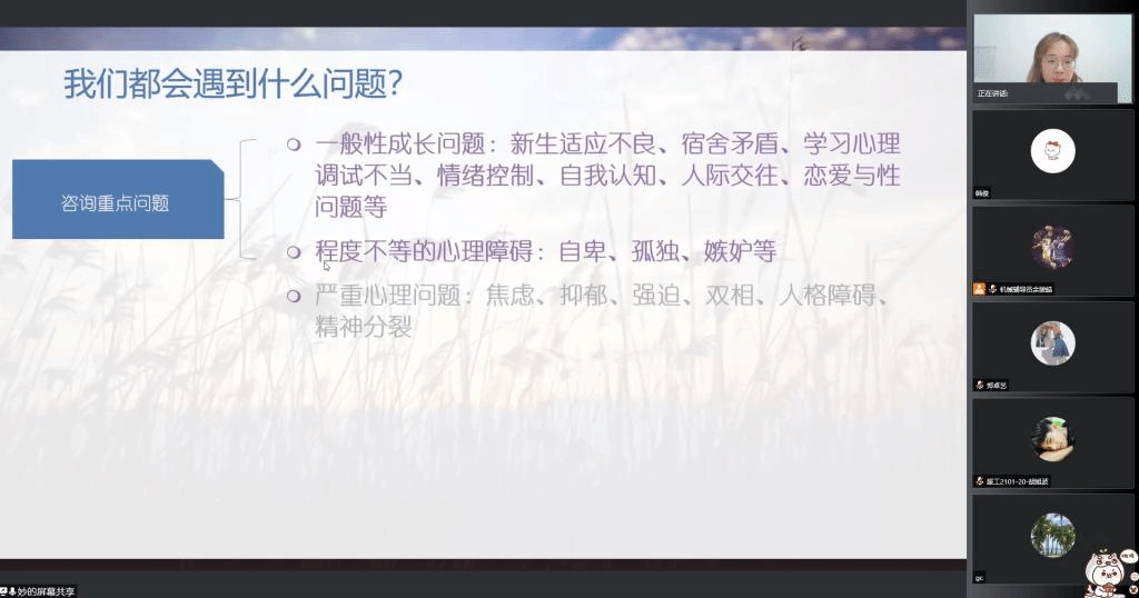 心理咨询工作的实际情况,缪老师对大学生常见的六种心理健康问题,如孤独心理、交往困惑、成瘾问题等进行了较为详细的介绍,为同学们讲解了问题的表现、导致原因、实例和积极的解决办法。在互动环节,缪老师通过心理健康的小问题与同学们进行交流,并帮助同学们对心理健康与否的常识性问题进行了区分。