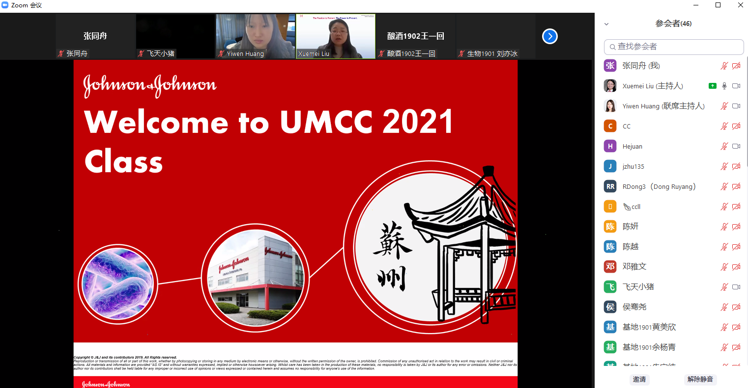 与强生(苏州)医疗器材有限公司2021年度校企合作课程(医疗器械和制药微生物学UMCC模块)开班并进行第一次授课。强生(苏州)公司微生物质量及无菌保证(MQSA)总监刘雪美、MQSA高级研究员黄奕雯、MQSA经理朱健杰、MQSA研究员董薷阳,91色