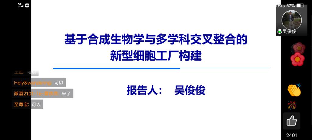 教授、博士生导师吴俊俊老师,吴俊俊老师以“基于合成生物学与多学科交叉整合的新型细胞工厂构建”为主题给同学们带来了一场精彩的讲座,近1000名本硕博同学参与本次讲座。