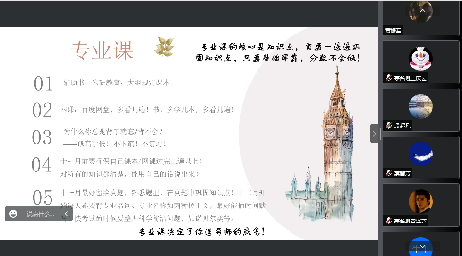 等国内知名高校的7名优秀学生,进行了专题分享。几名同学从考研院校选择、学硕和专硕区别、复习计划安排、学习方法、资料信息获取途径、常见误区等方面,详细讲解了自身的经验。大到生涯规划与职业选择,小到某一门专业课具体的复习方法,学长学姐们毫无保留,详尽地向学弟学妹们传经送宝,很好地增强了学弟学妹们考研的信心与动力。