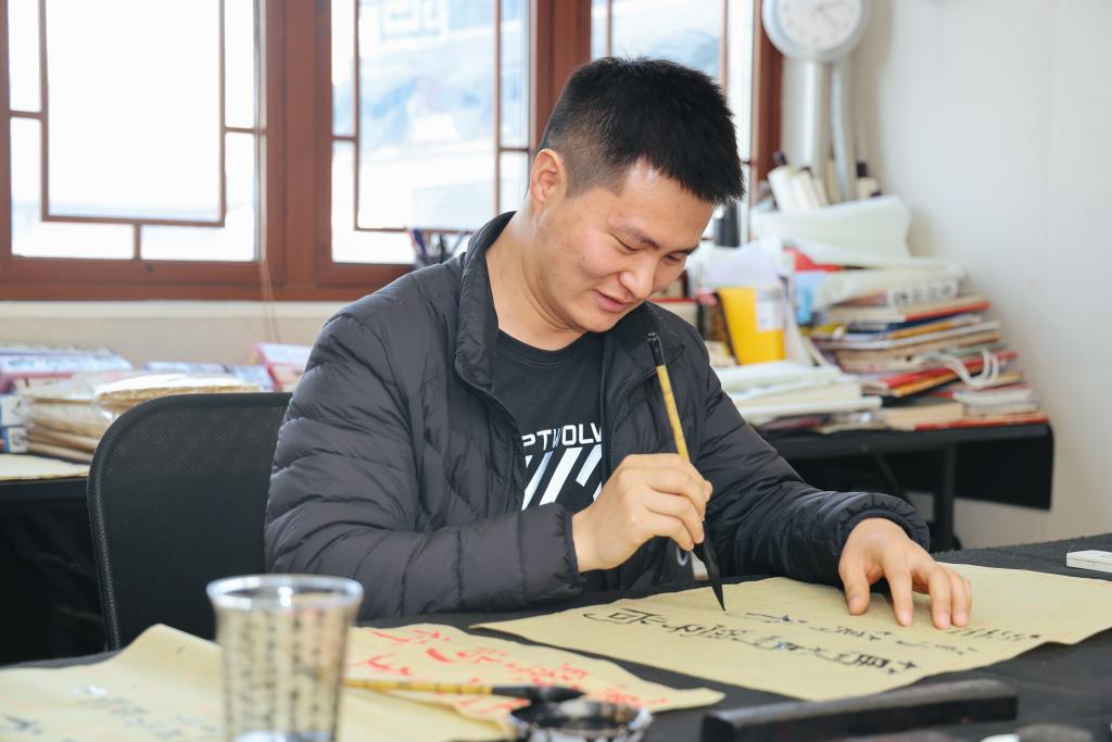 学习过后,同学们分组进行书法和国画体验。专业教学老师为同学们详细介绍了毛笔、宣纸、毛毡等基本工具的使用,向大家展示了书法和绘画中常用的笔法。同学们铺纸研墨,专注临摹,一时间翰墨飘香、氛围浓郁。绘画组《万紫千红总是春》《映日荷花别样红》色彩明丽,朝气蓬勃、生机盎然之意跃然纸上,书法组用古朴自然的隶书、体势方正的楷书写下《科技是第一生产力人才是第一资源创新是第一动力》《踔厉奋发勇毅前行》《笃学尚行止于至善》《善于实践勇于创新》等。一幅幅作品虽尚显稚嫩,流露的是同学们的拳拳真情。