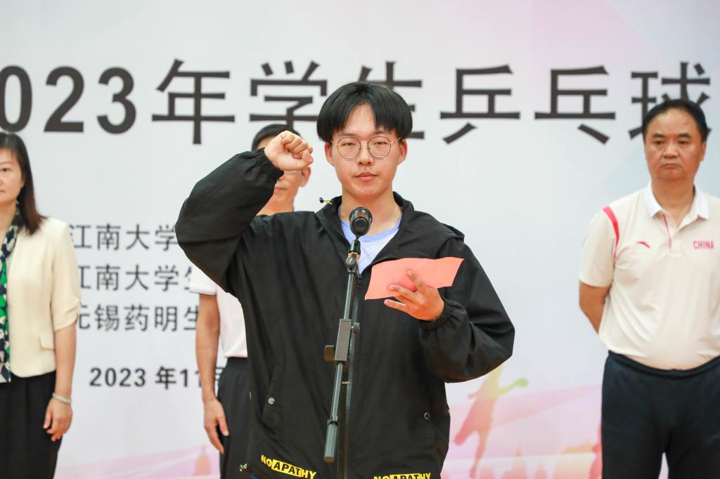 林丹在开幕式致辞中鼓励同学们积极参加体育运动,锻炼强健体魄与坚定意志,并祝愿全体运动员在本次乒乓球赛中赛出水平、赛出风度。随后运动员代表江晖、裁判员代表陈聪聪老师依次宣誓,表示将严格遵守比赛规则,秉承体育精神。接着,周建中宣布比赛正式开始。