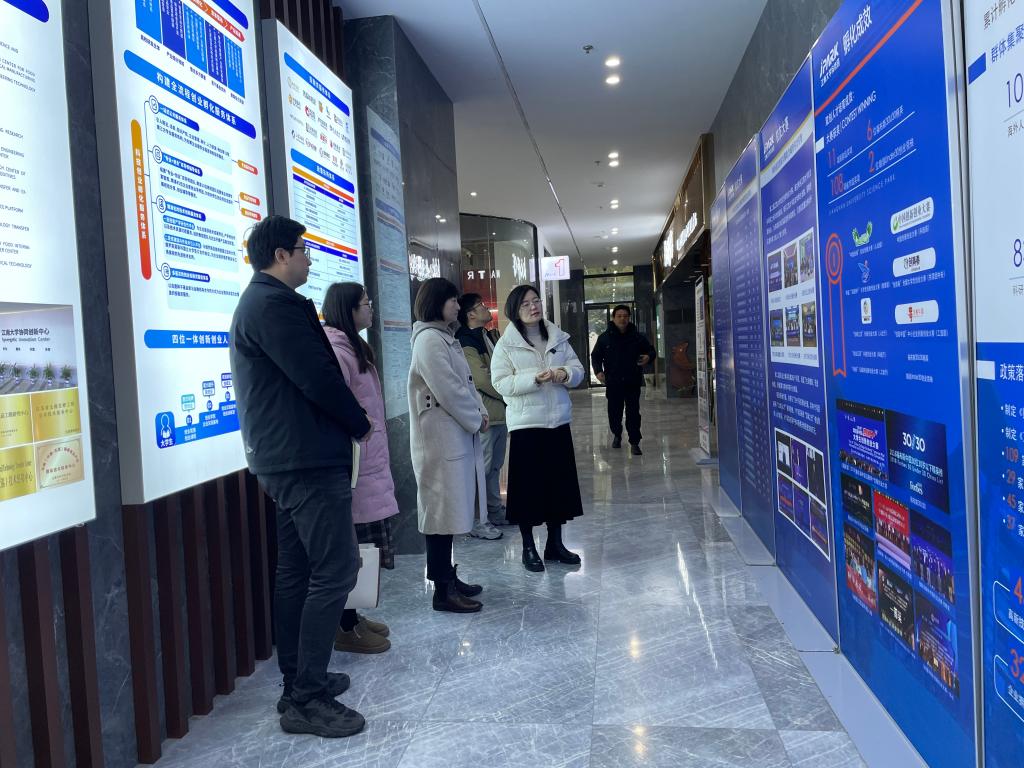 在园区展厅内,陈雪梅副总经理介绍了大学科技园的概况和发展历程,展示了近期在创新创业人才培养、科技成果转化及市校共建合作等方面所取得的成绩。她表示园区将充分发挥平台优势,架起校企携手育人的桥梁,为培养创新创业人才贡献力量。