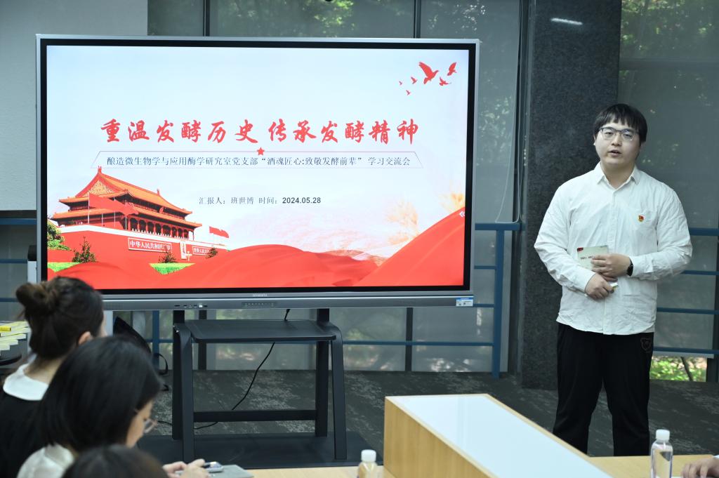 交流会在91色 酒科技馆举办,旨在带领师生沉浸式体悟发酵之光、学科力量。通过回顾第106期朱宝镛大讲堂暨中国酿酒大师访谈会现场,引出“致敬发酵前辈 吾辈勇担使命”的交流话题。党支部成员、2021级博士生班世博以“重温发酵历史 传承发酵精神”为主题展开分享,讲述中引经据典,带领师生重温那段峥嵘岁月,结合科研实际,他提到“发酵工程领域的前辈们引领发酵学科前进,作为行业后辈,当以前辈为榜样,站在巨人的肩膀上发奋图强。”
