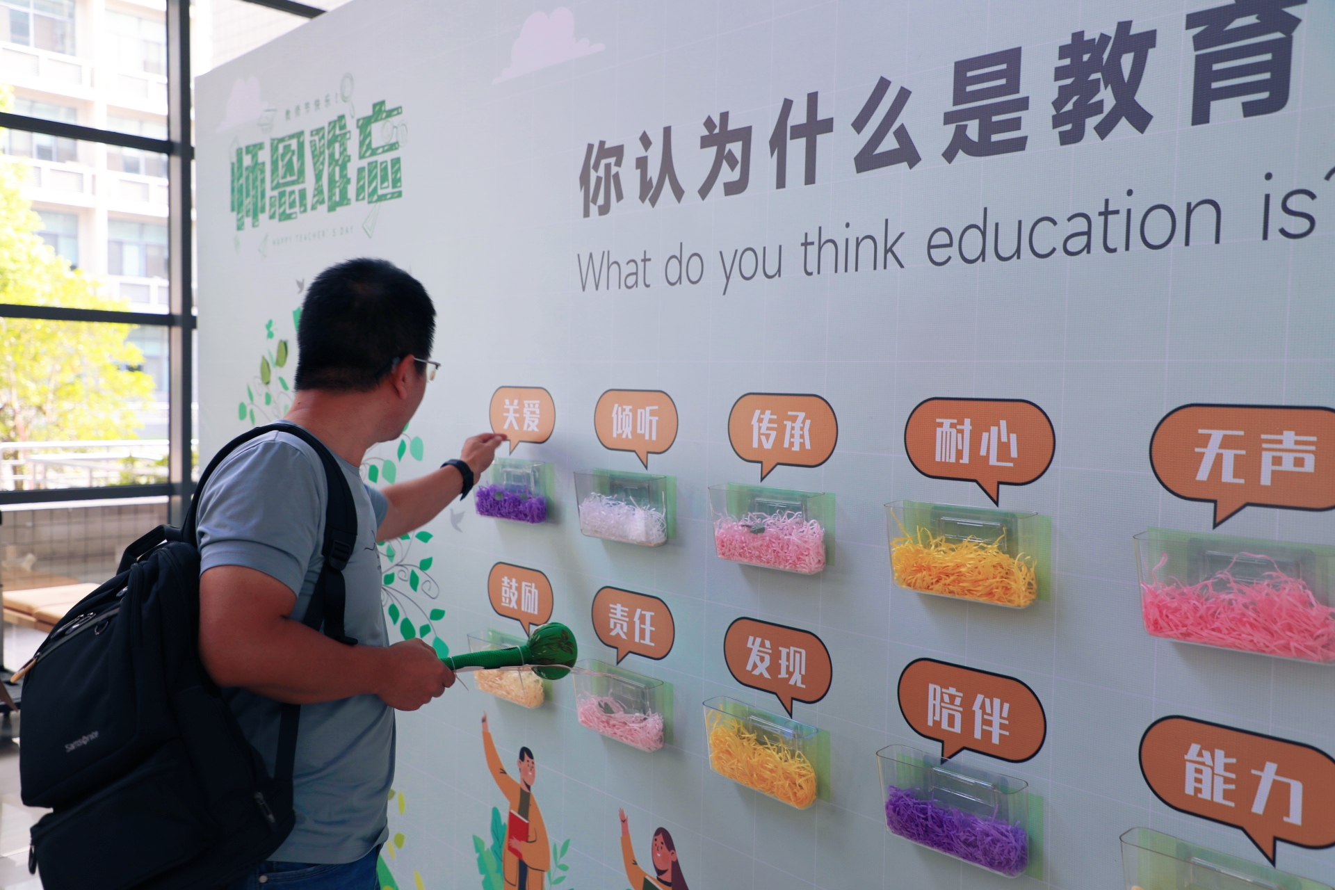 落其实者思其树,饮其流者怀其源。在鲜花、贺卡仿佛已是教师节标配的浪潮里,一支创意养生花束从万花丛中脱颖而出,既拥有花的外形,又具备鲜花无法兼顾的实用性。不被定义的“礼”,让节日更有温度。活动现场树形留言板上贴满了同学们用“树叶”传递的祝福,“祝愿老师生活不单调、每天带着笑”“虽然我不是您最好的学生,但您是我最好的老师”……还有国际留学生写上的英文祝福,字里行间情绪价值拉满。同学们的祝福视频也在学院电子屏幕上循环播放,吸引着老师们驻足观看。“你认为什么是教育”互动话题投票是今年教师节的一大亮点,师生共话以投票的方式选出心中的答案,共同探寻教育的真谛,在趣味性中融入了哲学意味。