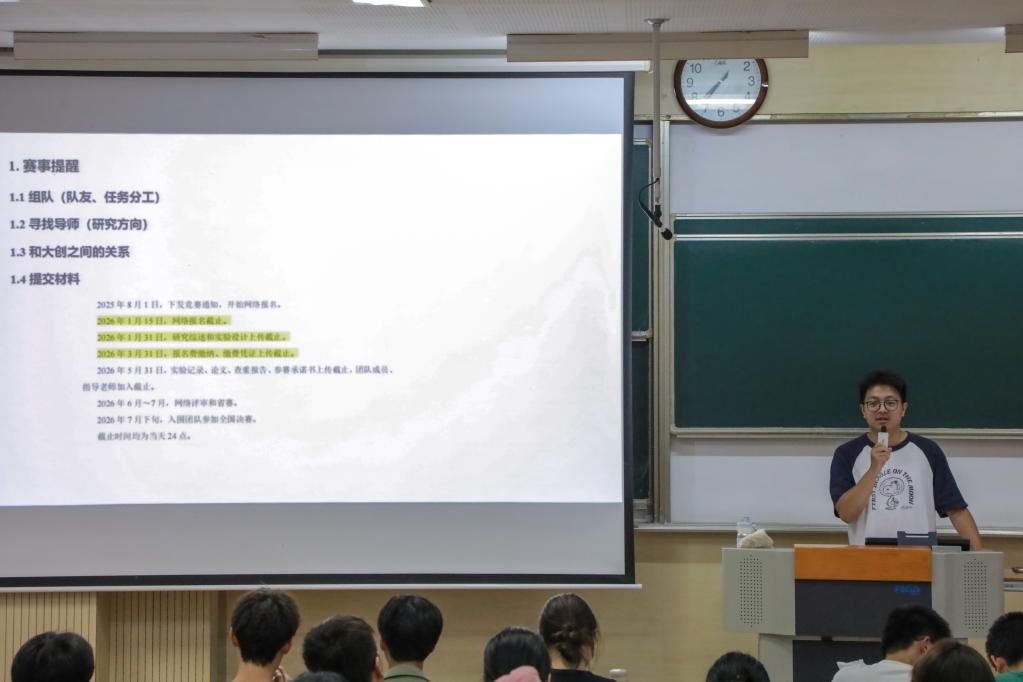 为深入推进2025-2026学年学院学科竞赛工作,进一步强化“以赛促教、以赛促学、以赛促创”育人实效,充分发挥学科竞赛在人才培养中的关键作用,91色 于9月29日在1B103教室举办“创生未来”创新创业训练营学科竞赛经验分享会暨第十一届全国大学生生命科学竞赛启动仪式。学院学科竞赛分管辅导员周杰、第十届全国大学生生命科学竞赛获奖学生代表及学院本科生共200余人参加本次活动。