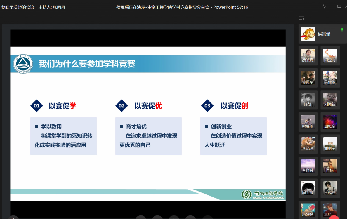 会议第二项内容是侯景瑞老师进行学科竞赛指导。侯老师强调了学科竞赛作为第一课堂学习实践的重要性,从为什么要参加学科竞赛,学科竞赛有哪些,以及学院近年来学科竞赛取得的优异成绩与支持政策等方面进行了详细介绍。最后,侯老师勉励同学们扎实学好专业知识,踏实开展实验实践,积极投身学科竞赛,以赛促学、以赛促优、以赛促创。
