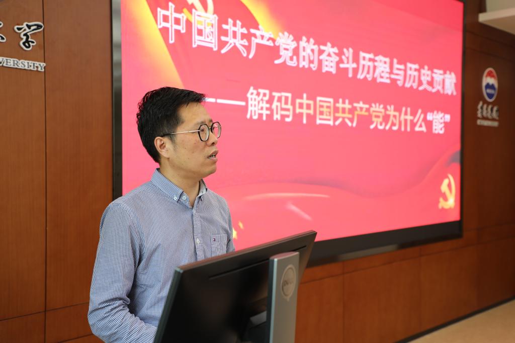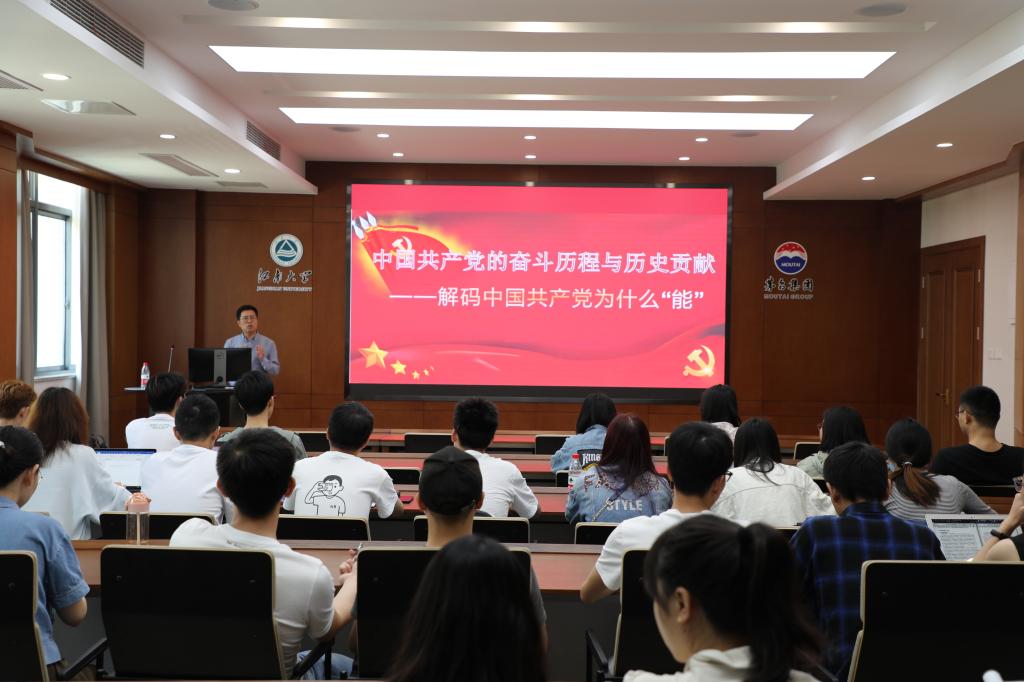 党委副书记周云龙在茅台厅为酿造微生物与应用酶学研究室党支部党员讲授党史学习教育专题党课《中国共产党的奋斗历程与历史贡献——解码中国共产党为什么“能”》。
