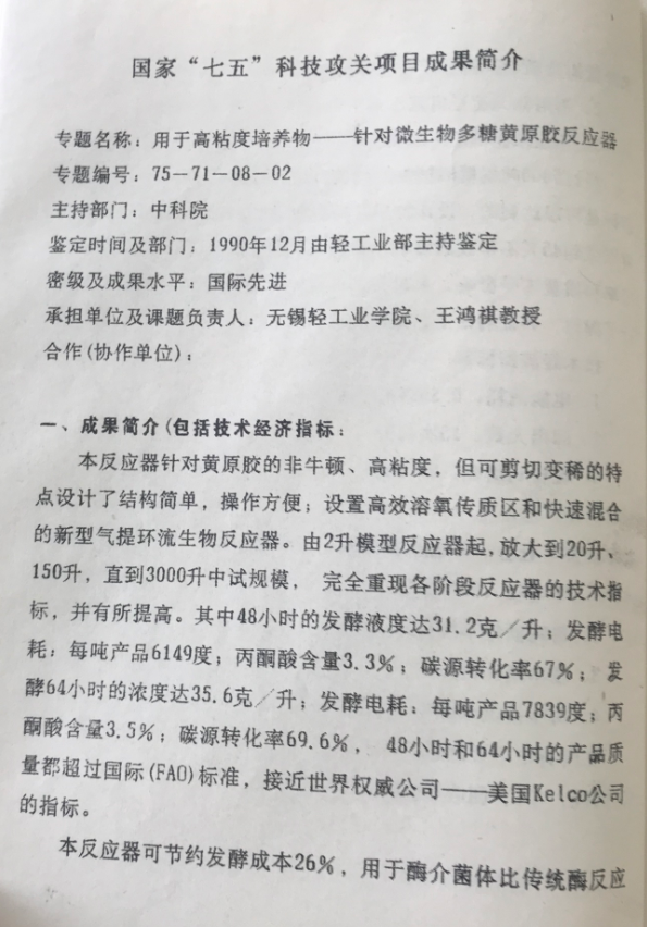 上世纪80年代,他作为国家七五科技攻关专题项目的主持人,完成了黄原胶生物反应器研制项目,通过了中国科学院组织的专家鉴定验收,获得好评,并获得原国家轻工业部科技进步三等奖。当时评奖很难,一等奖几乎没有,二等奖也很少。