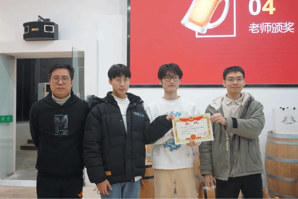 是中国酿酒工程师的摇篮,同学们要传承老一辈酿酒大师的发酵精神,身体力行“勇于创新、善于实践”的精神。周书记一番话鼓舞了所有在场人的信心。随后,精酿俱乐部主席郜子航给大家汇报了本学期的工作并做出了来年展望。过年的一年中,俱乐部同学们完成了啤酒车间的装饰美化,进行了丰富而充满趣味的果啤酿造比赛与品鉴活动,俱乐部黑天鹅拉格和红色艾尔两支作品参加了2021CBC中国国际啤酒挑战赛,并最终获得天禄奖一星的好成绩。俱乐部指导老师及品酒部同学为同学们自酿的果啤产品进行了品鉴,并为果啤酿造比赛中表现优秀的同学颁奖,以资鼓励。展望未来,俱乐部将继续定期开展酿酒及品酒活动,继续参加国内外啤酒相关赛事,进一步拓展与国内酿酒专业兄弟高校的交流与合作。