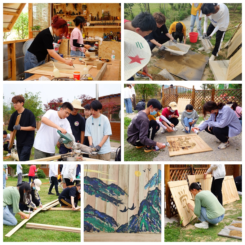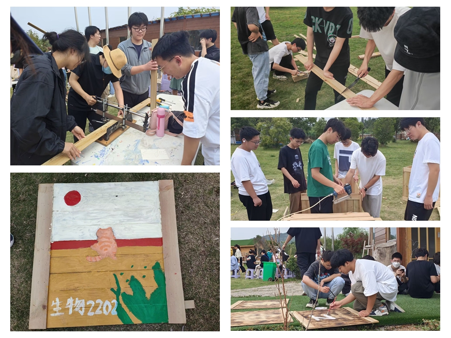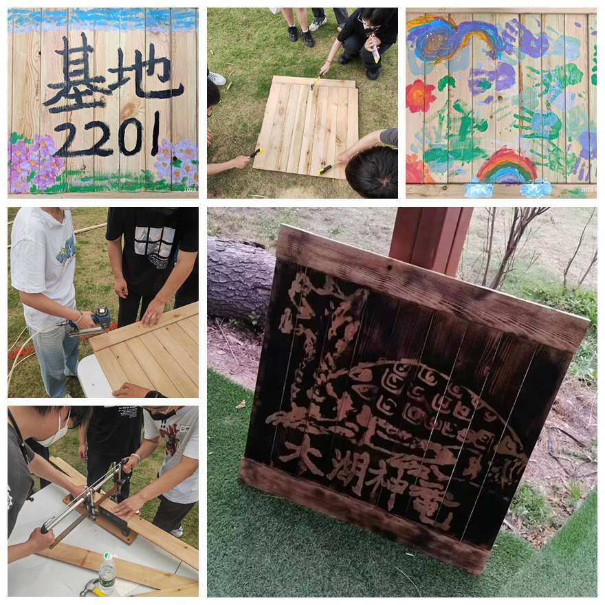 本次活动的主题是农耕文化创意美陈。同学们首先分成八组,按尺寸切割长木条,并将它们拼接成面板。然后,在每块面板上绘制图案,其中两块面板通过泥绘和彩绘的方式,分别呈现了校训和院训中的一个字,而其他四块面板则由同学们自由发挥创作,绘制了许多风格各异的图画。最后,将六块面板拼接在一起,形成一个立方体木箱,通过团队合作完成了一组农耕文化创意美陈。