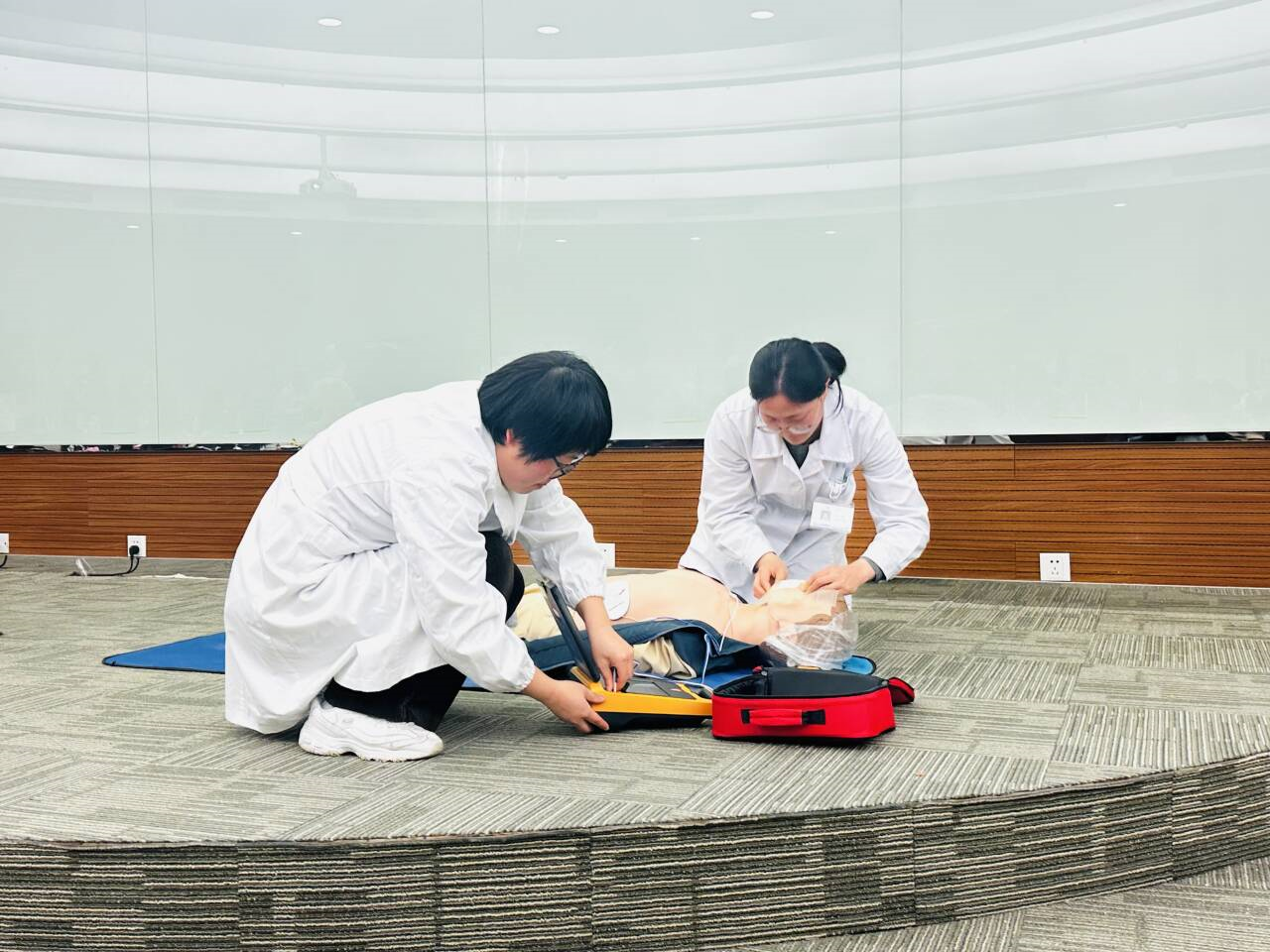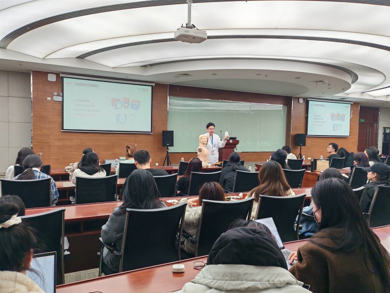 校医院、无锡市红十字会杨文军老师主讲,现场通过科普讲座、模拟演练等形式开展急救知识普及。