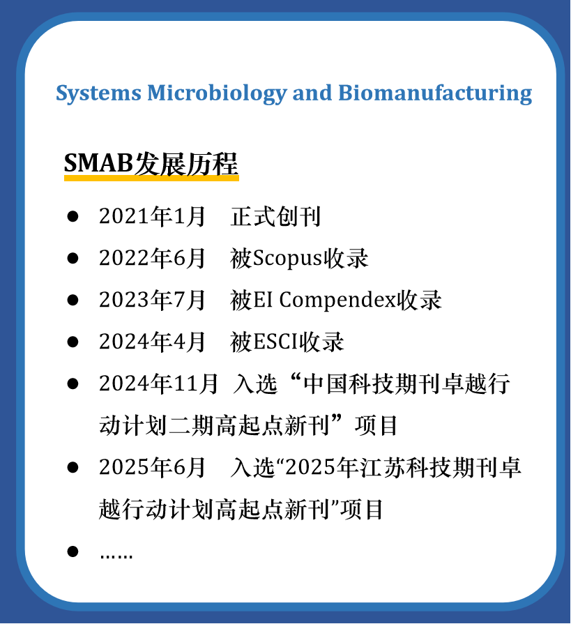 主办的《系统微生物学与生物制造》(Systems Microbiology and Biomanufacturing,简称SMAB)成功入选。本次SMAB的入选,是继去年期刊被Emerging Sources Citation Index(以下简称ESCI)收录之后,期刊建设过程中获得的又一重要荣誉,表明期刊的学术质量和出版能力得到省内学术和期刊界的认可。