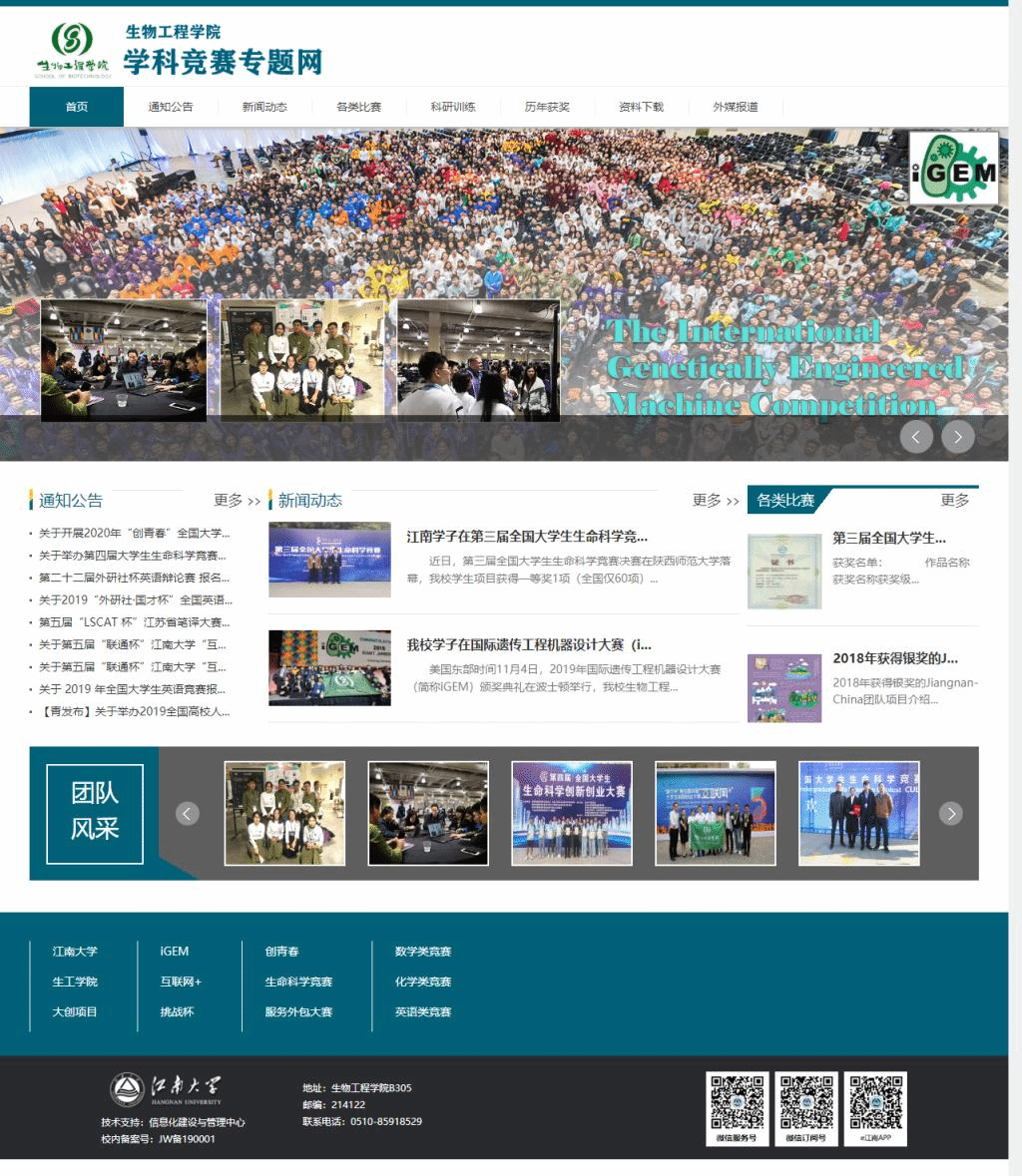 学科竞赛专题网”,网站给师生提供了一个专门针对学科竞赛交流分享的平台、信息获取的平台、新闻宣传的平台。学院各个学科竞赛的获奖情况在学校、学院的官方网站、微信微博上有画面、有声音,近年来,校内外报道学院学科竞赛情况25次,8个获奖新闻登上学校官网头条,1 个项目情况登上“双创新生代”电视节目,2个获奖情况获网易新闻等知名媒体报道。学院注重网上网下结合,多措并举将“善于实践,勇于创新”的生工精神融入学科竞赛工作全过程,以新生适应性教育课程、年级大会、讲座报道等为契机专门介绍各类学科竞赛情况,邀请获奖学生在交流分享参赛经验。