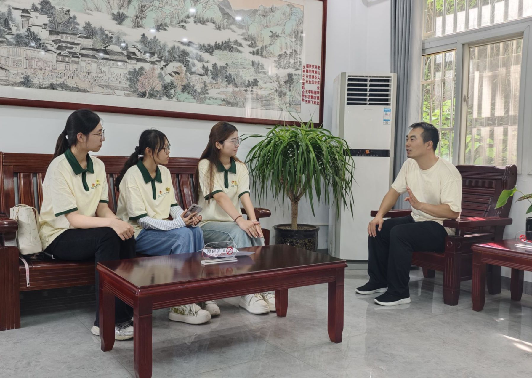 乡村振兴—绿芽下的致富密码。作为中国十大名茶之一,六安瓜片是世界上唯一无芽无梗的茶叶,产自安徽六安大别山一带,属绿茶特种茶类,其外形平展匀整,色泽宝绿,香高味醇。制作工艺独特,“拉老火”环节更是以160℃- 180℃高温烘焙150次以上,才炒出独特茶香。麻埠镇地处金寨县,是六安瓜片的核心产区。这里群山环抱、云雾缭绕,土壤富含矿物质,茶树在山林间与果树共生,芽叶肥壮,为茶叶品质奠定基础。为深入了解小镇的茶文化以及村民生活水平,实践小组成员前往镇政府与麻埠镇团委书记汪彦坪进行座谈交流。