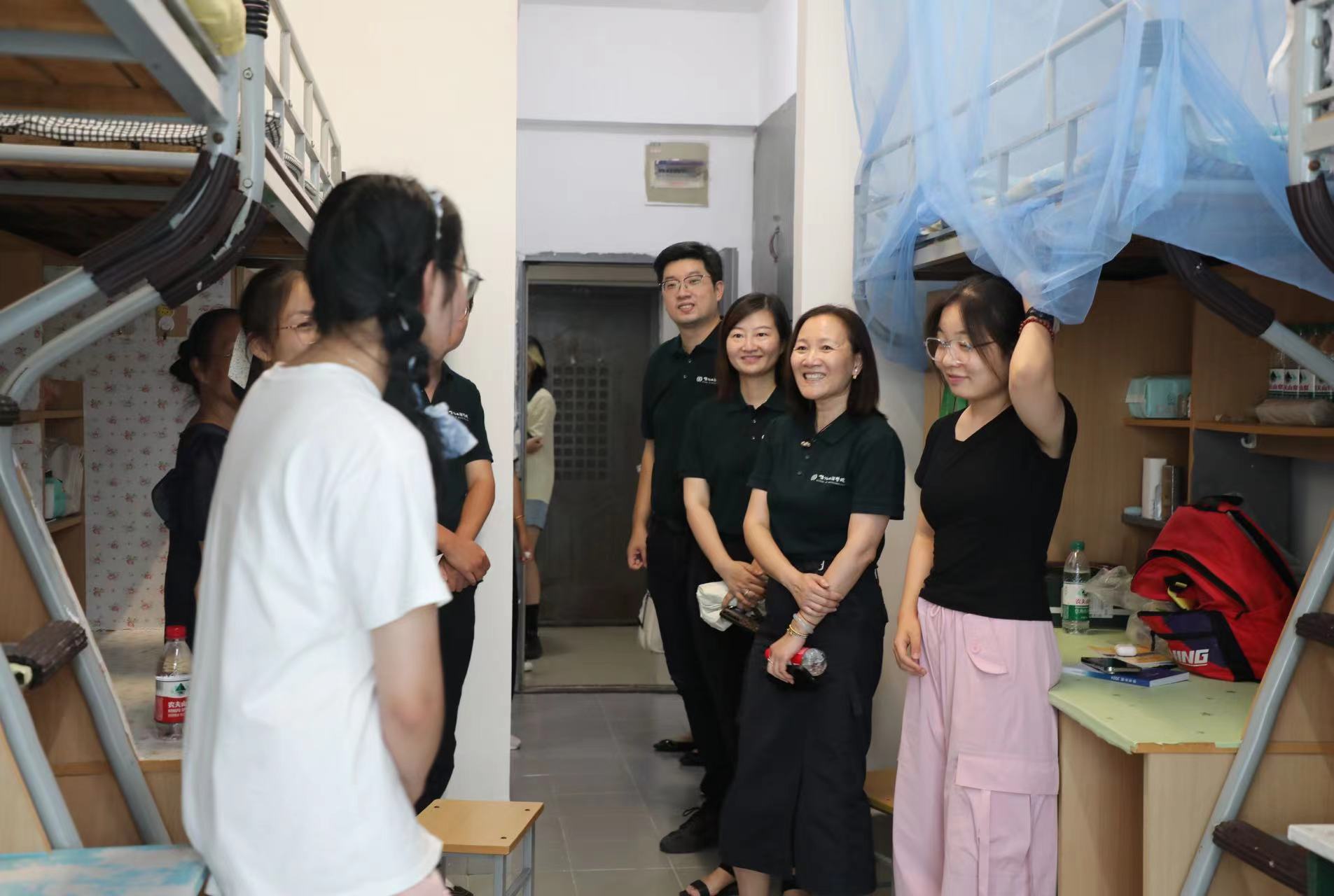 领导和老师走进新生宿舍,与同学们进行了面对面的交流,关心同学们的生活起居和专业学习期待,并就新生入学教育、军训安排、宿舍安全、反诈防骗等进行了解答和提示。同学们纷纷表示深切感受到了学院对同学们无微不至的关心与关爱,面对即将展开的大学生活,将以昂扬的精神面貌积极融入新环境、拥抱新梦想、投身新征程。