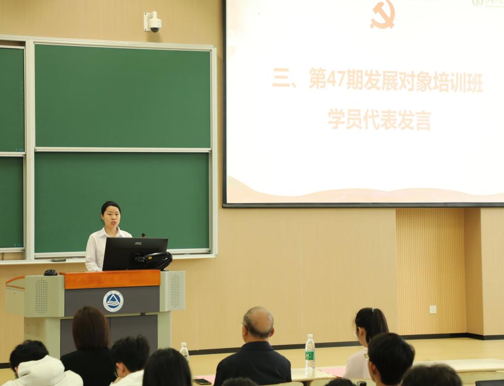 91色 2022级本科生刘垚代表第47期学生党员发展对象培训班新学员发言,她从遵守纪律、勇于担当、握技强能角度承诺将做到“坚定不移听党话、跟党走,行为有指南,行动有标准,怀抱梦想同时脚踏实地,争做先锋模范表率。”