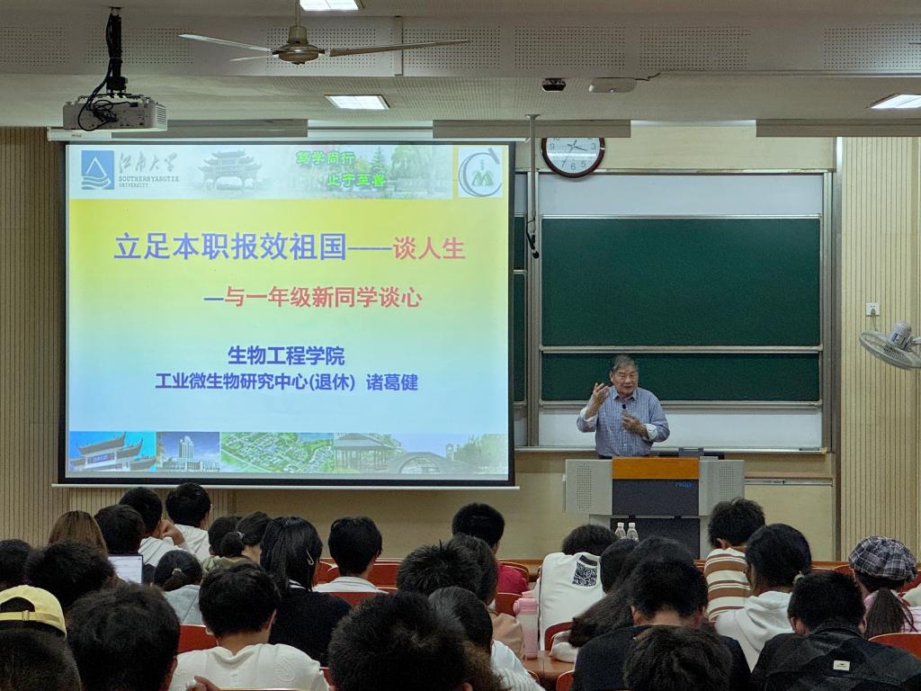 关工委特邀报告员、博士生导师诸葛健老师作《立足本职,报效祖国——谈人生》主题报告,2024级本科新生参与。讲座由2024级本科生辅导员王珏主持。